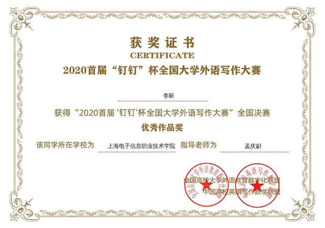 外语学院英语系李昕同学喜获“钉钉”杯全国大学外语写作大赛优秀作品奖