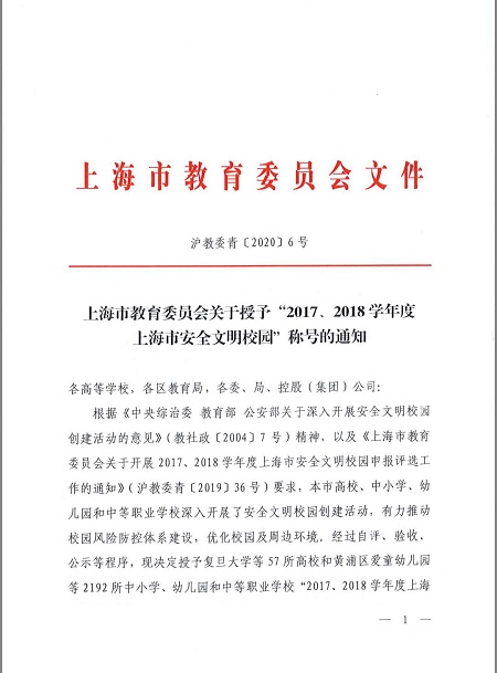 365官网荣获“2017、2018学年度上海市安全文明校园”称号