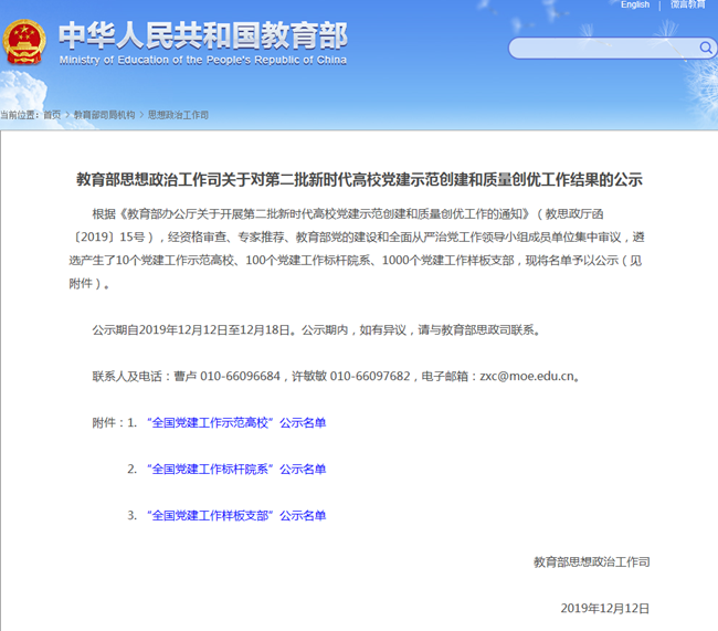2019年12月12日,根据《教育部办公厅关于开展第二批新时代高校党建示范创建和质量创优工作的通知》(教思政厅函〔2019〕15号),经资格审查、专家推荐、教育部党的建设...