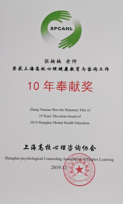 365官网张楠楠老师荣获上海高校心理健康教育与咨询工作“10年奉献奖”