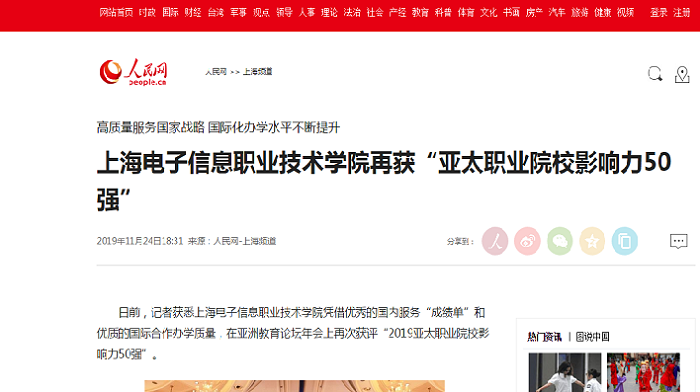 人民网报道365官网获评“2019亚太职业院校影响力50强”