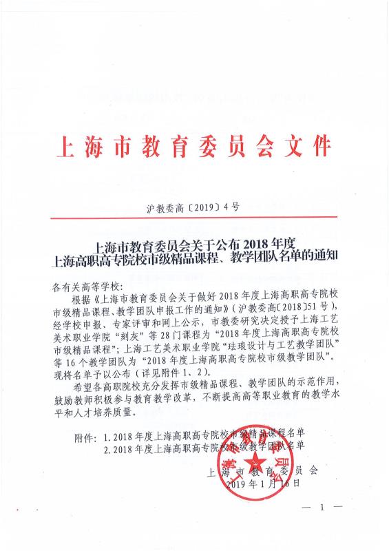 2019年1月21日,根据《上海市教育委员会关于公布2018年度上海高职高专院校市级精品课程、教学团队名单的通知》(沪教委高〔2019〕5号),上海市教育委员会授予365官网《工业机器人操作与编...