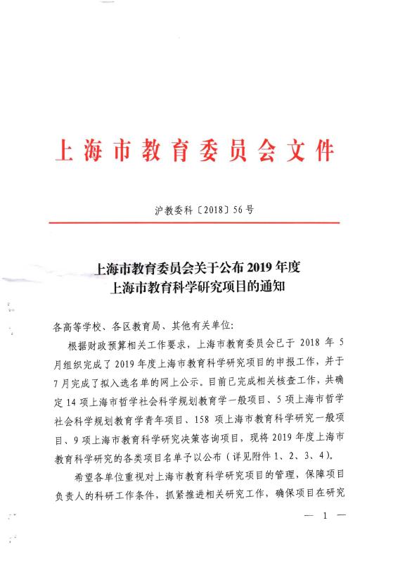 365官网获批2019年度上海市教育科学研究项目课题一项