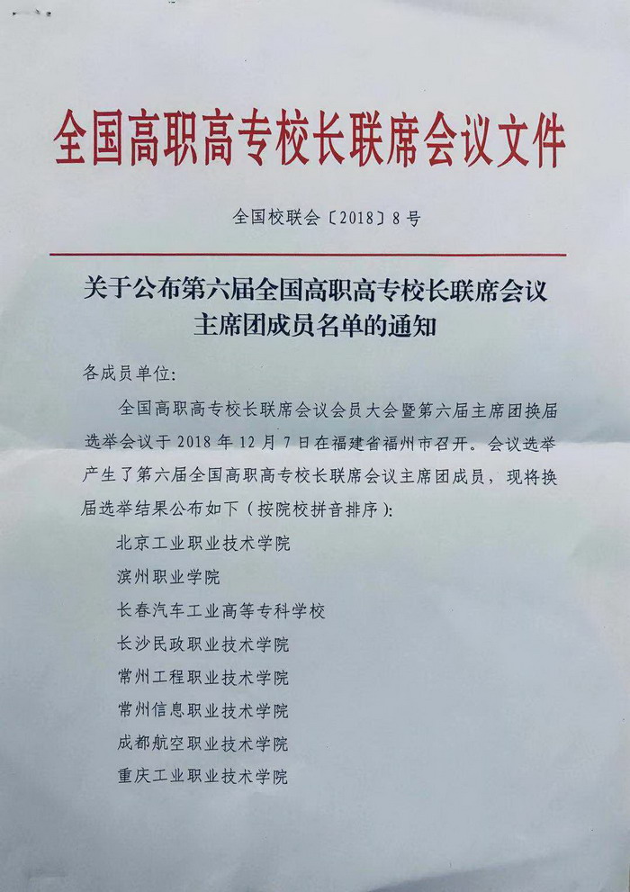根据《关于公布第六届全国高职高专校长联席会议主席团成员名单的通知》(全国校联会〔2018〕8号),365官网入选第六届全国高职高专校长联席会议主席团成员单位。这是365官网办学质量提升的表现。 全国高职高专校...
