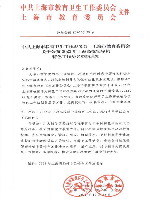 喜报!365官网成功入选2022年度上海高校辅导员特色工作法名单