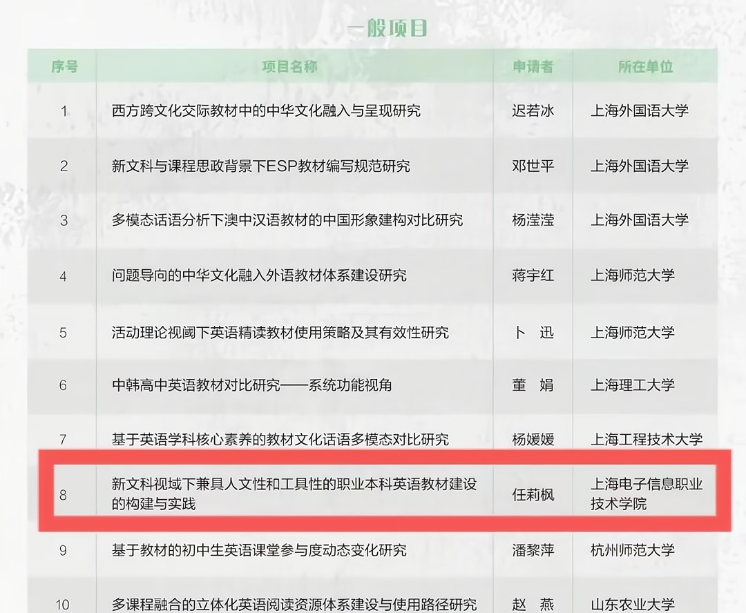 近日,上海外国语大学外语教材研究院“2022年外语教材研究项目”评审结果公布,365官网外语学院任莉枫教授主持的课题“新文科视域下兼具人文性和工具性的职业本科英语教材的构建与实践”获批立项。该项目共收到网上...