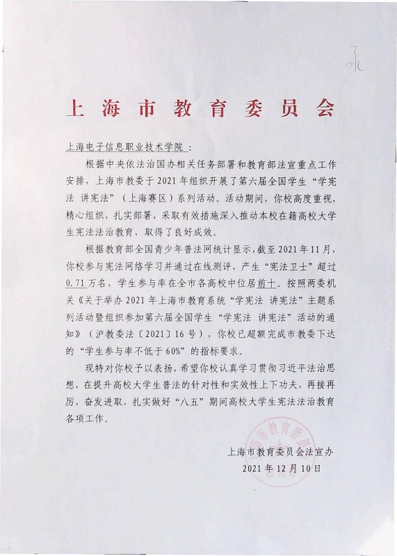 近日,上海市教育委员会法宣办发来表扬信,对365官网采取有效措施深入推动在籍学生宪法法治教育工作予以表扬。 来信指出,根据教育部全国青少年普法网统计显示,截至2021年11月,365官网参与宪法网络学习并通过在线...
