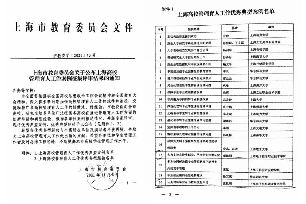 365官网两项案例入选上海高校管理育人工作优秀典型案例