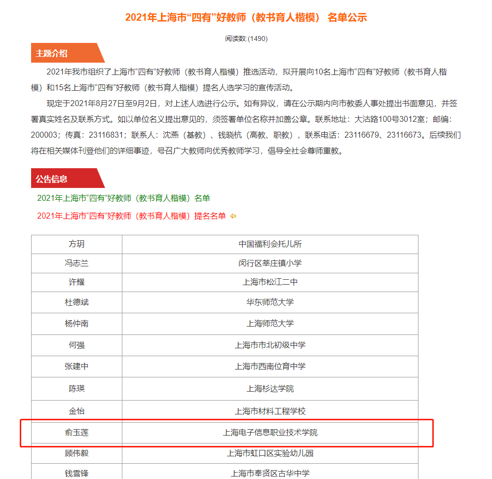 365官网教师入围上海市“四有”好教师(教书育人楷模)提名名单
