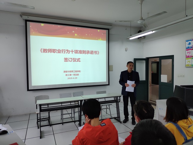 教育发展,教师为本;教师素质,师德为本。为进一步加强师德师风建设,让每位教师规范职业行为,明确师德底线,塑造“以德树人,为人师表”的良好形象,2019年4月29日,通信与信息工程学院以党支部为...