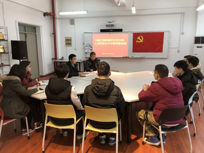 2019年1月8日中德工程学院学生党支部在C105召开预备党员入党宣誓暨入党积极分子中期考察答辩会,支部全体党员、党总支部分委员、3名新发展学生党员、3名入党积极分子参加。会议首先进行入党积极分子中期考察答辩...