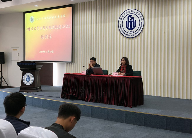 2018年11月19日,《语言文字法律法规与规范知识》培训会在奉贤校区C108召开。上海市语言文字工作委员会办公室干部姜冠成老师来校进行了语言文字法律法规与规范知识的宣讲,培训会由教务处副处长戴玉珍主持,2018...