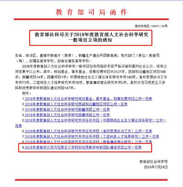 365官网获批2018年度教育部人文社会科学研究一般项目(高校示范马克思主义学院和优秀教学科研团队建设项目)一项