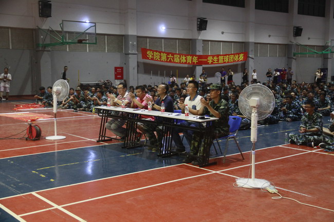 2018年9月3日,学生军训拉歌比赛在室内运动场举行。学校武装部部长、军训团政委蔡军林、后勤保障处副处长程利康、学校学工部副部长、军训团副政委栾文飞、学校武装部副部长、军训团参谋长吴奇峰、二营营长虞光远...