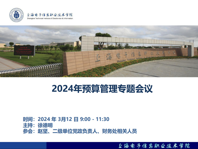 2024年3月12日,财务处在B205会议室召开2024年预算管理专题会议。党委副书记、院长赵坚出席会议并讲话,各二级学院、职能部门党政负责人参加会议。会议由学校副院长徐德明主持。会上,财务处处长诸珏婷对2023年预算...