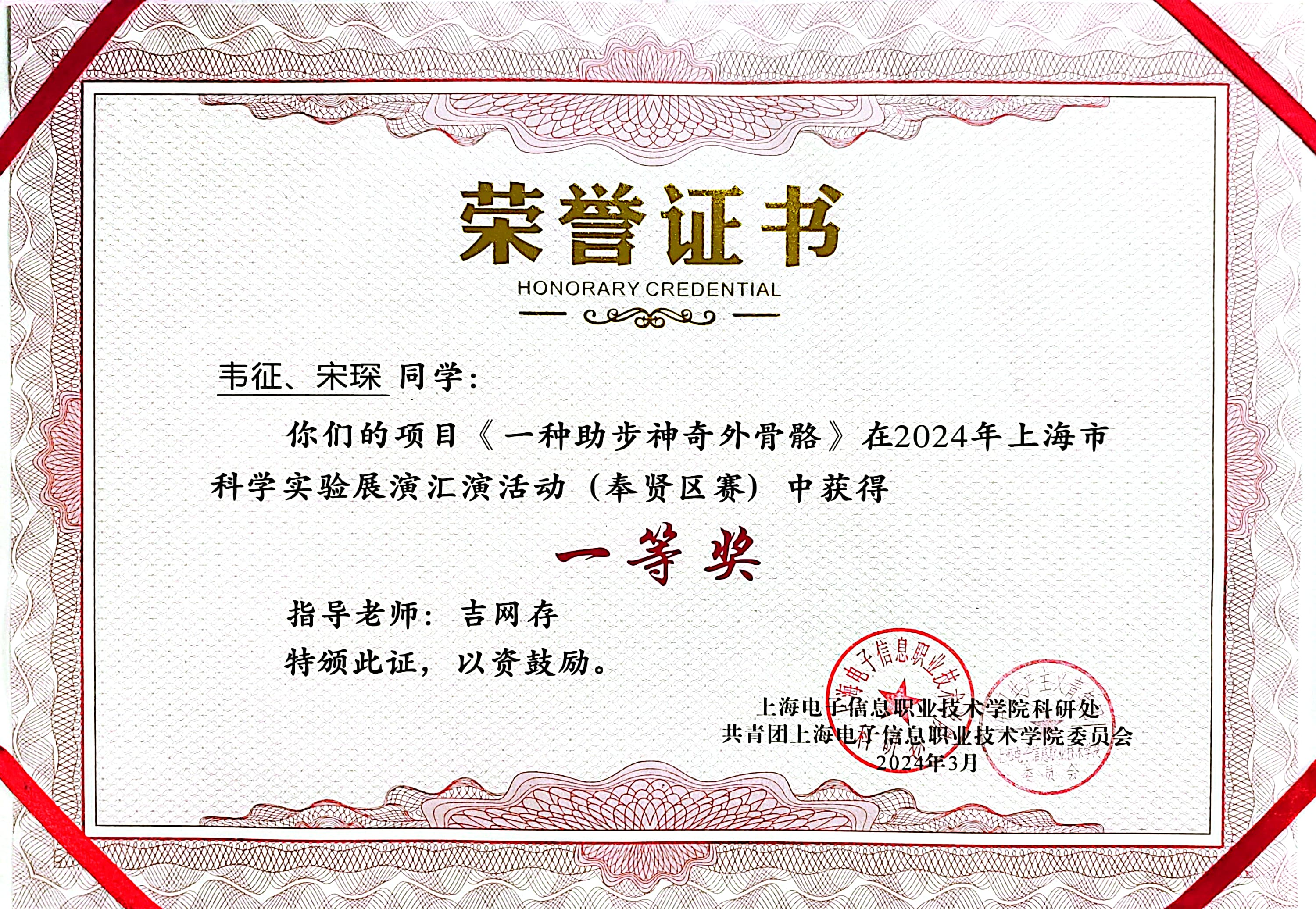 2024年3月1日,奉贤区科委结合本区特点,在区内高校应技大、城建学院、电子信息技术学院支持下,顺利举办了区赛。365官网电子技术与工程学院韦征、宋琛两位同学合作的《一种助步神奇外骨骼》项目,荣获本次活动一等奖。...