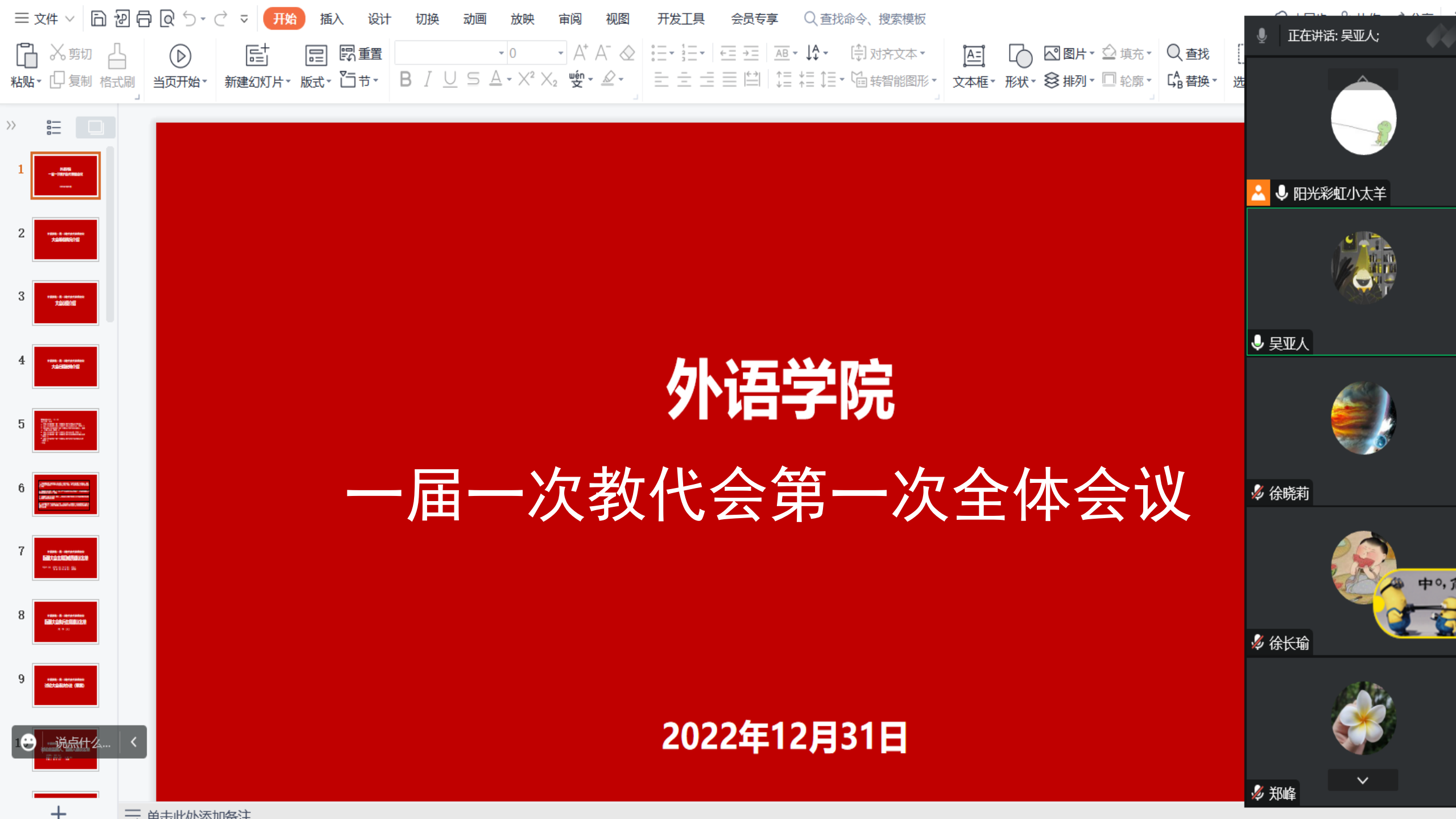 在深入学习贯彻党的二十大精神之际,外语学院一届一次教职工代表大会于12月31日在线上顺利召开。会议由外语学院工会主席向华主持,学院32名教代表和列席代表齐聚云端参会。大会在庄严的国歌声中正式开幕。外语学院肖...