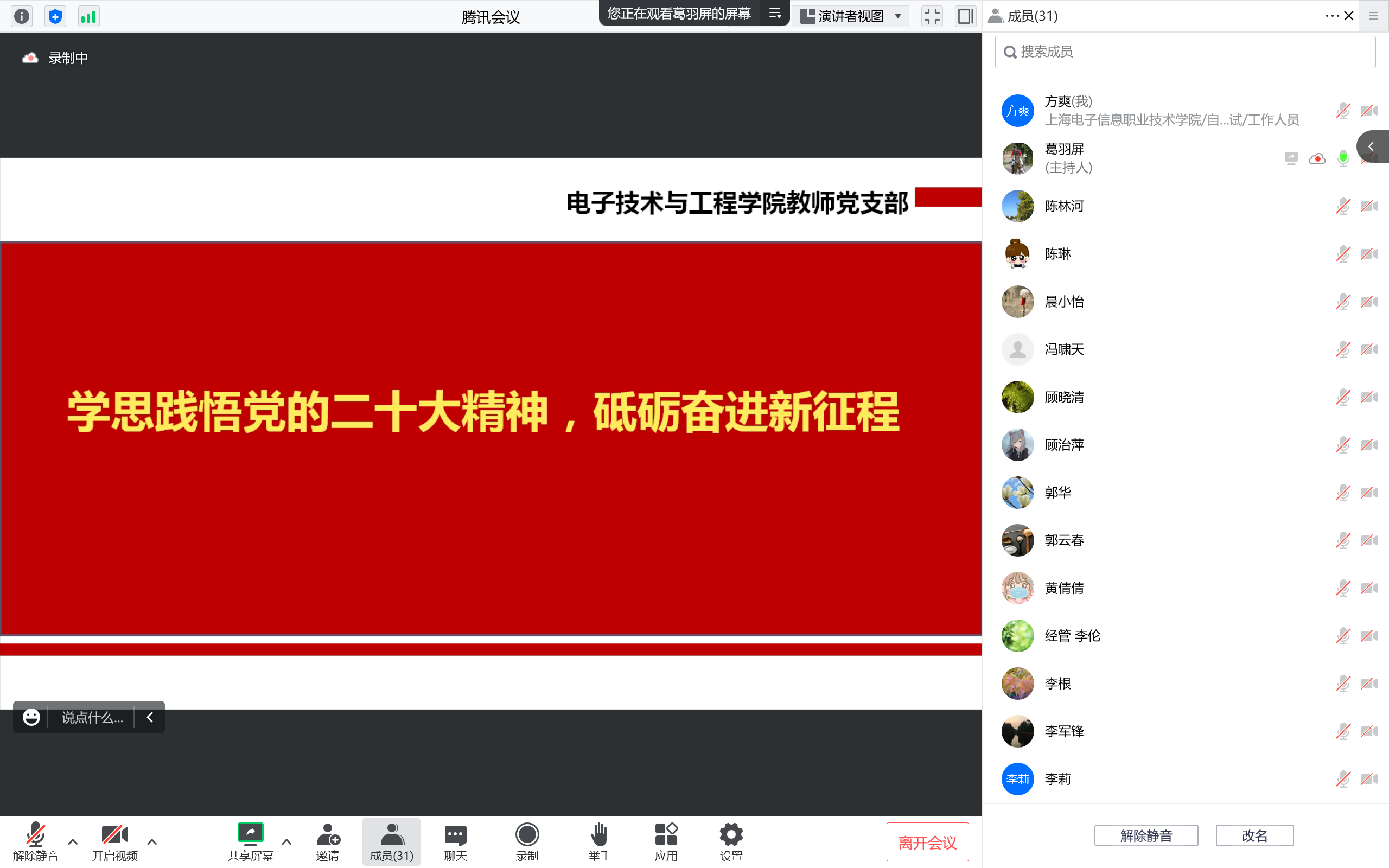 为深入学习贯彻党的二十大精神,2022年12月22日,电子技术与工程学院教师党支部举行了党的二十大精神研讨主题党日活动。教师支部全体党员参加,活动由教师党支部副书记葛羽屏主持。本次活动以线上形式开展并邀请了各...