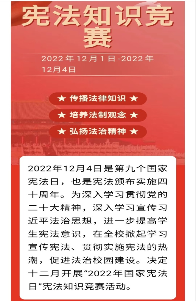 2022年12月4日,是现行宪法实施四十周年,也是第九个国家宪法日。为弘扬宪法精神,增强宪法意识,在第九个国家宪法日到来之际,马克思主义学院与学生工部共同举办“2022年国家宪法日”宪法知识竞赛活动,马克思主义...