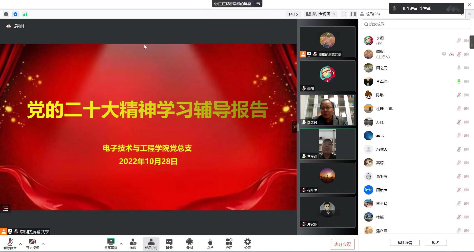 为深入学习宣传贯彻党的二十大精神,2022年10月28日,电子技术与工程学院党总支利用腾讯会议形式,邀请华东理工大学徐国民教授进行党的二十大精神学习辅导讲座。会议由党总支书记李军锋主持。学院全体党员参加会议。...